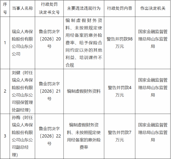 3月24日,国家金融监督管理总局山东监管局官网公示的行政处罚决定书(鲁金罚决字〔2026〕20号、21号、22号、23号、24号、25号)显示,瑞众人寿山东分公司以及5名相关责任人因违法违规被警告并罚款。