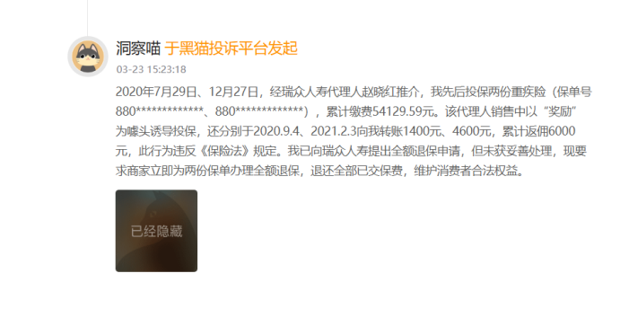 3月23日,一投诉者投诉,瑞众保险代理人诱导投保返佣。该投诉者表示,2020年7月29日、12月27日,经瑞众人寿代理人推介,其先后投保两份重疾险,累计缴费54129.59元。该代理人销售中以“奖励”为噱头诱导投保,还分别于2020年9月4日、2021年2月3日向其转账1400元、4600元,累计返佣6000元。