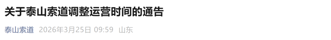 3月25日,泰山索道发布消息,3月28日起,泰山索道调整运营时间,详情如下: