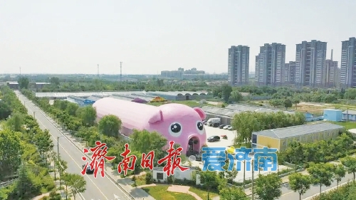 在章丘区双山街道三涧溪村北部,一栋长76米、高13.5米的粉红色猪形建筑“章小福”格外引人注目,这是济南源虎食品有限公司打造的一个充满“猪”元素的“产学研”融合的农乐园。从最初开办生态黑猪养殖场,到组建总占地13余公顷的合作社,再到如今建成“产学研”融合的农乐园,返乡创业青年王元虎借着三涧溪村快速发展的东风,闯出了一条致富路。
