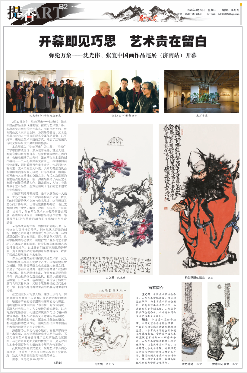 本次展览以“弥纶万象”为主题,“弥纶”二字取自传统文论,意为包容涵盖、贯通天地,既契合中国画写意言志、包罗世间风物的艺术内核,也精准概括了沈光伟、张宜两位艺术家的创作格局——二人扎根齐鲁文化沃土,深耕中国画传统笔墨,同时兼顾当代审美表达,作品题材各有侧重、艺术风格互为补充,共同勾勒出当代山东中国画创作的多元风貌,以笔墨为媒,绘出自然万象与人文精神的交融之美。作为本次巡展的重要站点也是最后一站,济南站集结了两位艺术家近年创作的精品力作,涵盖花鸟、人物、书法等多个艺术品类,全方位展现了他们的艺术追求与创作积淀。