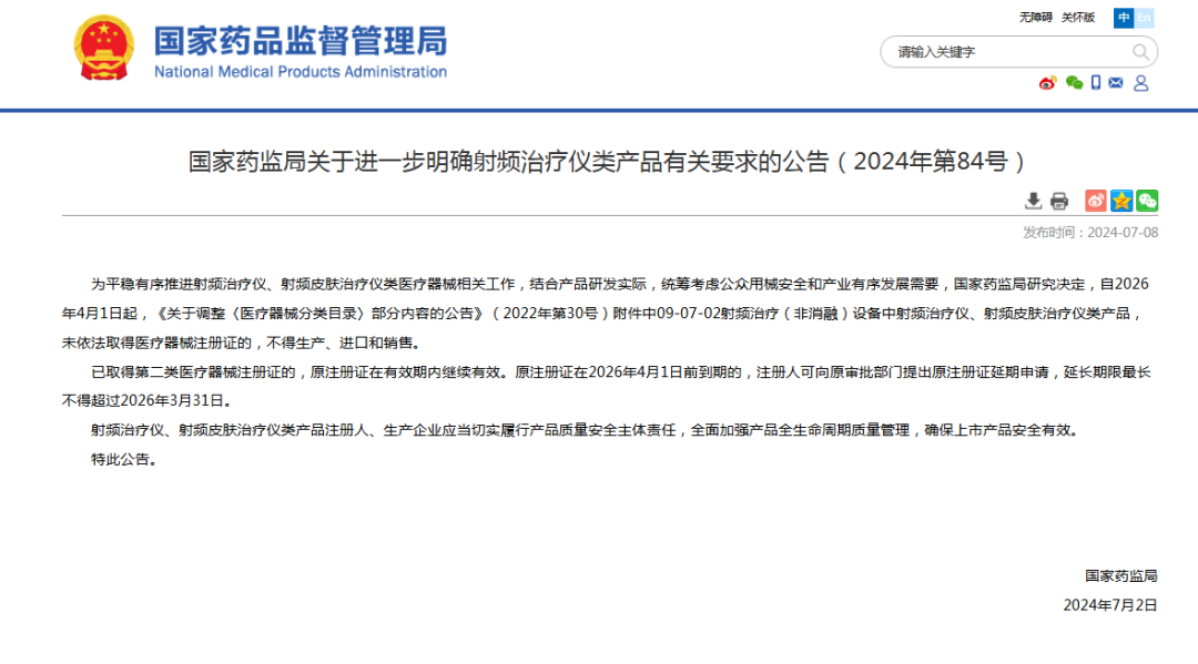 此前,国家设置了两年过渡期(2024年4月1日-2026年3月31日)推动行业整改,过渡期结束后,未依法取得医疗器械注册证的射频治疗仪、射频皮肤治疗仪类产品,不得生产、进口和销售。