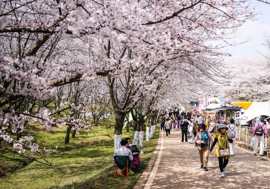 11일 구이저우성 구이안신구의 벚꽃단지를 찾은 상춘객들. (사진/신화통신)