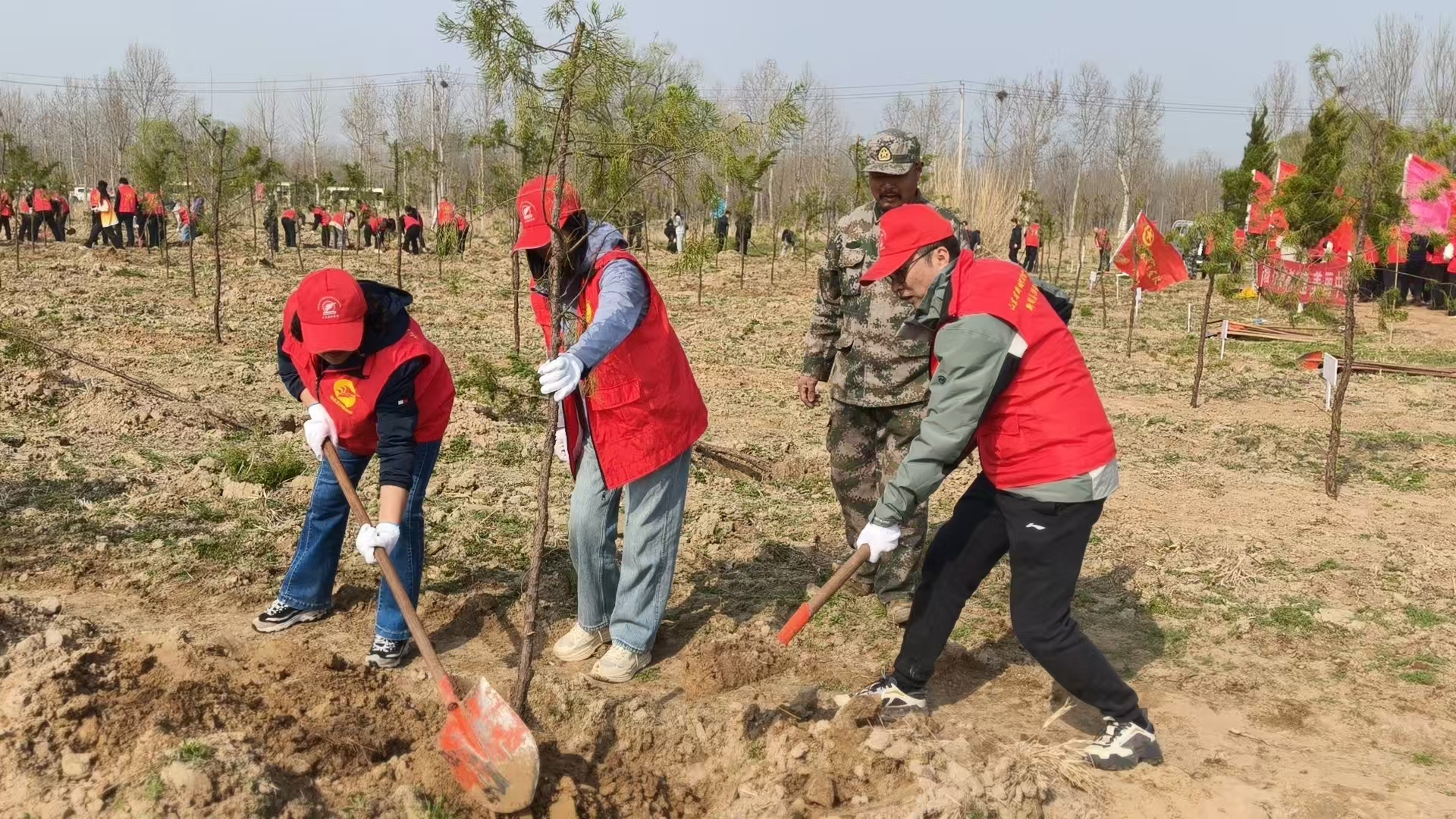 上午9时许,集团参与人员抵达植树现场,迅速投入劳动。队伍中既有朝气蓬勃的年轻同事,也有即将退休的老同志,大家老少搭档、分工协作,挥锹铲土、扶苗培根、踩实围堰,现场忙碌而有序。经过一上午的共同努力,两排30余株龙柏树苗迎风挺立,在“志愿红”的映衬下更显勃勃生机,为北郊林场再添一片新绿。