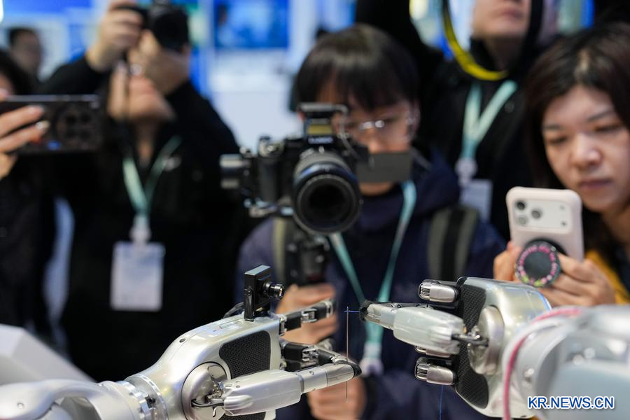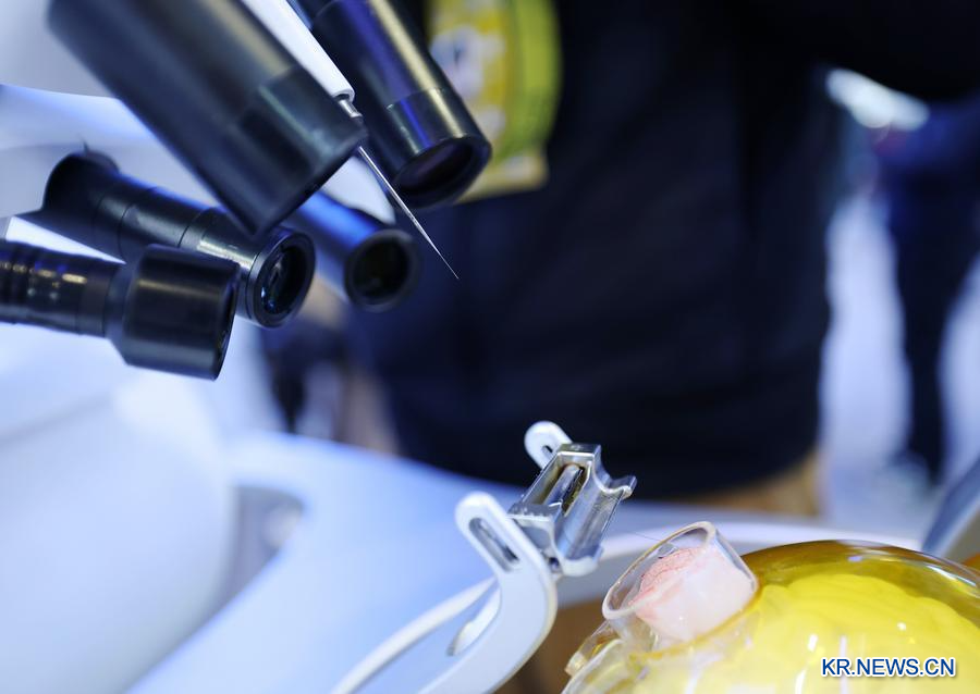 24일 중관춘(中關村)전시센터 상설전시장에서 한 로봇이 민첩한 손놀림으로 바늘에 실을 꿰고 있다. (사진/신화통신)
