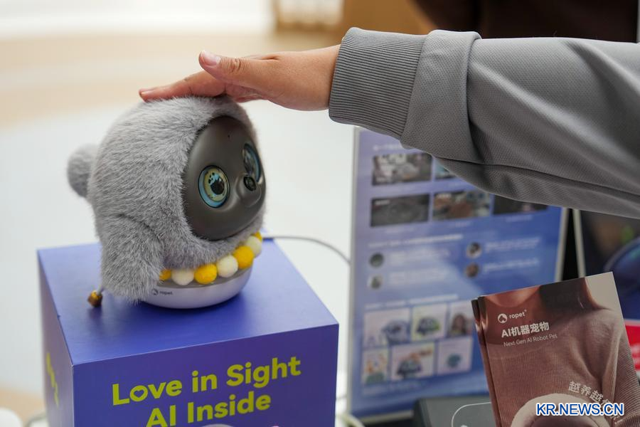 24일 중관춘 국제혁신센터에서 인공지능(AI) 로봇 반려동물을 쓰다듬는 관람객. (사진/신화통신)