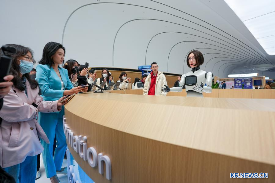 로봇 샤오눠(小諾·오른쪽 첫째)가 24일 중관춘 국제혁신센터 안내데스크에서 관람객에게 자신을 소개하고 있다. (사진/신화통신)