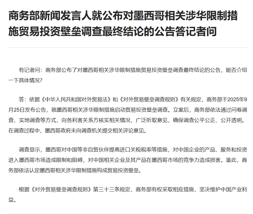 据商务部网站消息,根据《中华人民共和国对外贸易法》和《对外贸易壁垒调查规则》有关规定,商务部于2025年9月25日发布2025年第53号公告,决定对墨西哥相关涉华限制措施进行贸易投资壁垒调查。