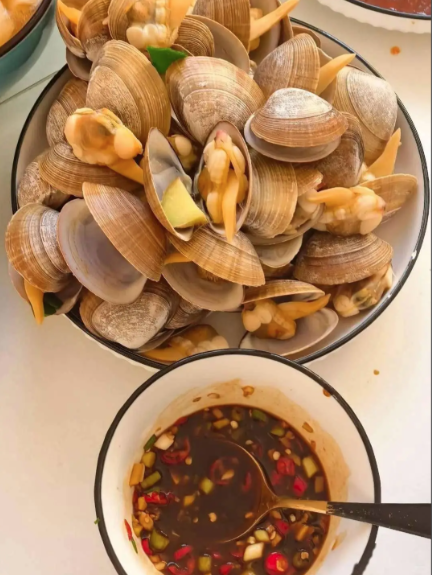 第二种,清水煮蛤蜊,最能保留蛤蜊本味的家常做法,也是来青岛必尝的经典吃法。来青岛游玩,一定要试试这份“原汁原味”,把吐净沙的蛤蜊洗净,直接放入锅中,加一瓢清水和几片姜片,大火煮沸,待蛤蜊一个个张开外壳,立刻捞出,煮蛤蜊的汤汁会变成乳白色,浓稠鲜美,喝一口暖到心底。吃的时候不用复杂调味,蘸少许生抽或香醋,就能充分品尝到蛤蜊的“天下第一鲜”。