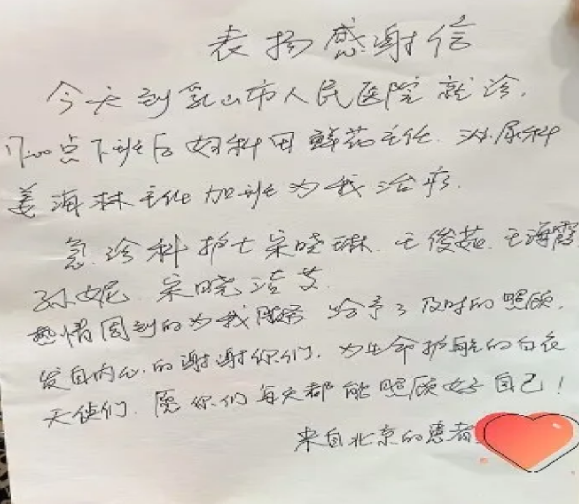 近日,一封来自北京游客杜阿姨的表扬信,送到了乳山市人民医院急诊科,字里行间满是感激与认可。杜阿姨独自来乳山银滩探亲期间突发身体不适,前往医院门诊就诊后,恰逢药房下班,无法领取药品。身处异地、无人陪同的杜阿姨焦急无助,抱着试一试的心态来到急诊科求助。