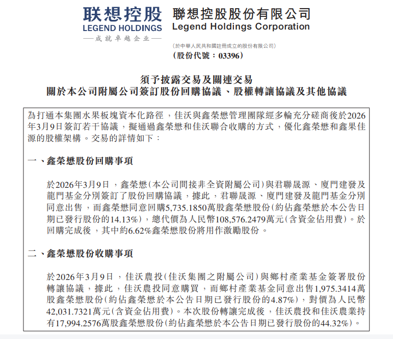 近日,联想控股(03396)发布公告称,为打通集团水果板块资本化路径,其附属公司佳沃集团与鑫荣懋管理团队经多轮磋商,签订多项股份回购、转让及激励协议,通过联合收购方式优化鑫荣懋及关联公司鑫果佳源股权架构,全力推进鑫荣懋港股上市进程。