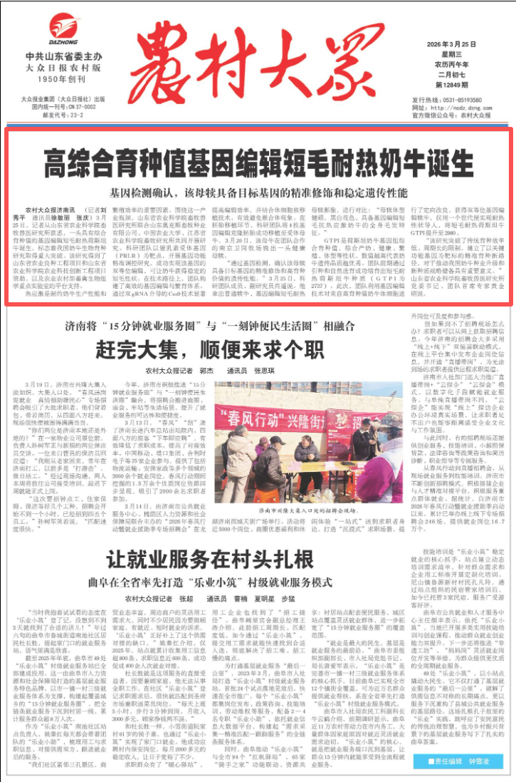 “该研究突破了传统育种效率低、周期长的限制,建立了以关键功能基因为靶标的精准育种新路径,对于推动我国奶牛种业升级和新种质战略储备具有重要意义。”山东省农业科学院畜牧兽医研究所党委书记、团队首席专家黄金明说。