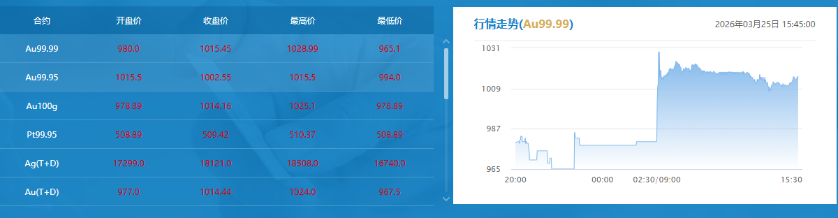 上海黄金交易所实时行情数据显示,3月25日,黄金Au99.99日间交易收盘价报1015.45元/克。来源:上海黄金交易所官网