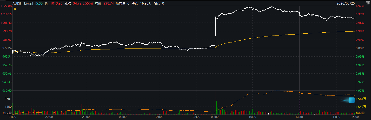 受国际金价上涨影响,国内黄金克价重回1000元上方。上海黄金交易所实时行情数据显示,3月25日,黄金Au99.99日间交易收盘价报1015.45元/克。沪金期货主力合约也重回1000点关口,截至3月25日收盘,报1013.96%,上涨3.55%。