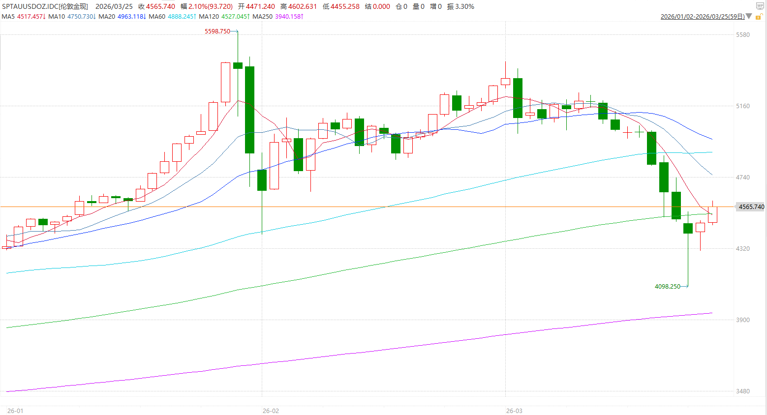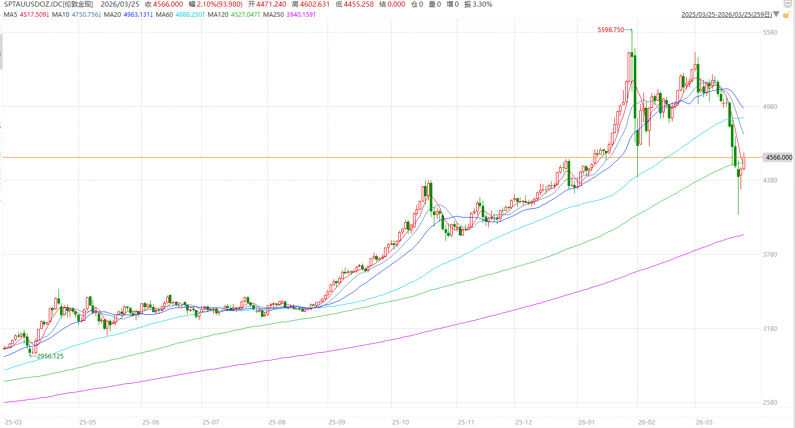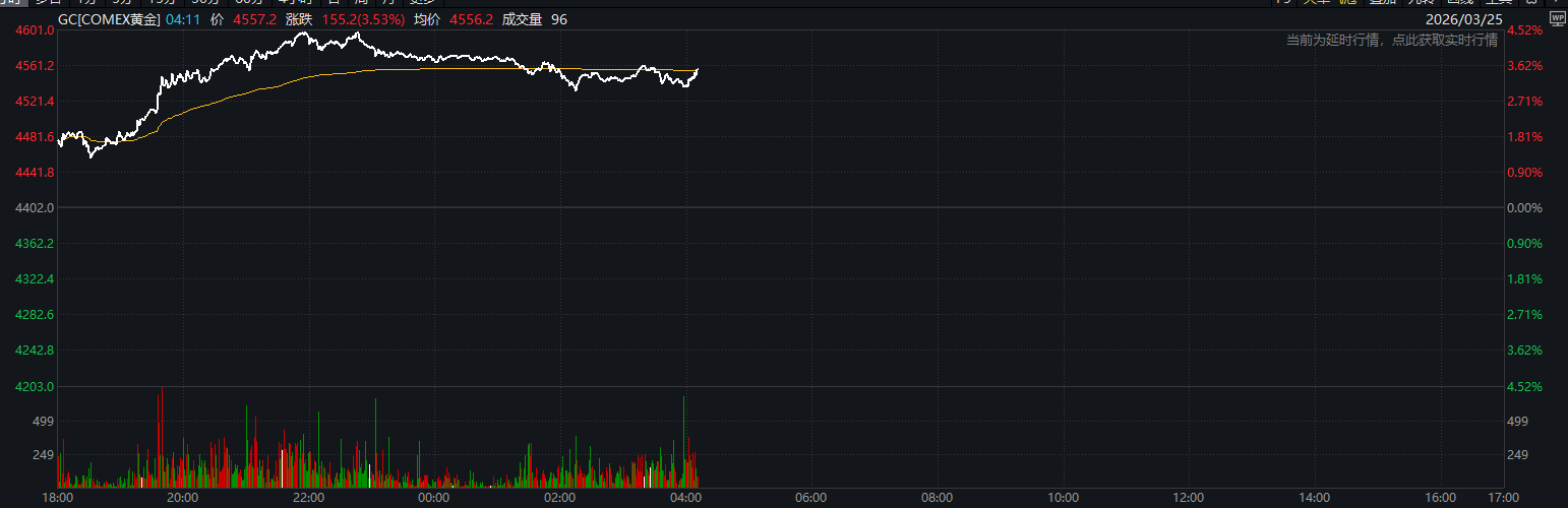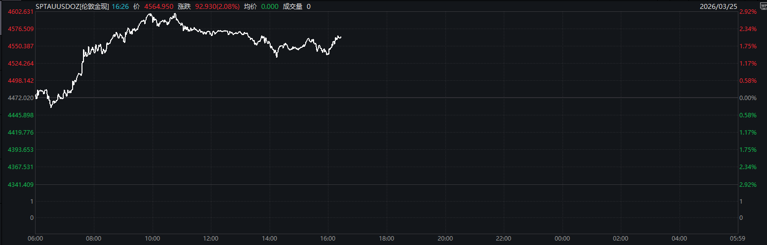 3月25日盘中,伦敦现货黄金价格一度站上4600美元/盎司。截至北京时间16点26分,伦敦现货黄金价格报4564.950美元/盎司,日内涨幅2.08%;COMEX黄金价格报4557.2美元/盎司,日内涨幅3.53%。