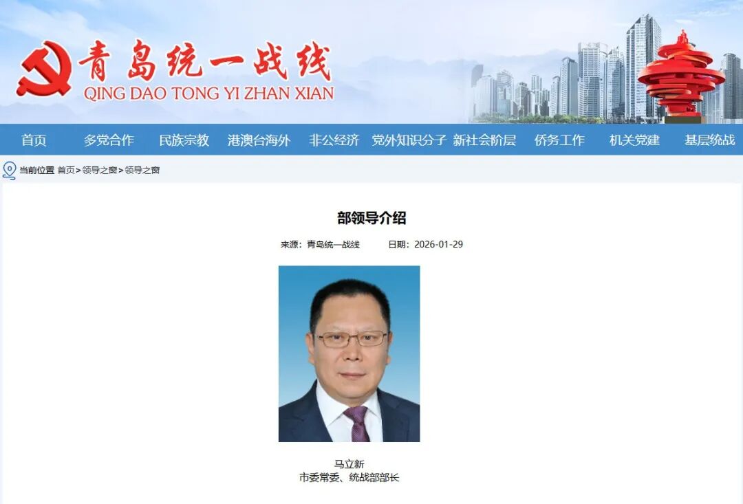 据青岛市委统战部官方网站“青岛统一战线”消息,马立新已任青岛市委常委、统战部部长。马立新,男,汉族,1967年11月生,山东龙口人,大学经济学学士,1990年7月参加工作,1990年5月加入中国共产党。现任山东省青岛市委常委、市纪委书记、市监委主任,市委巡察工作领导小组组长。齐鲁晚报微信公号来源:青岛统一战线网站、公开资料编辑:刘齐