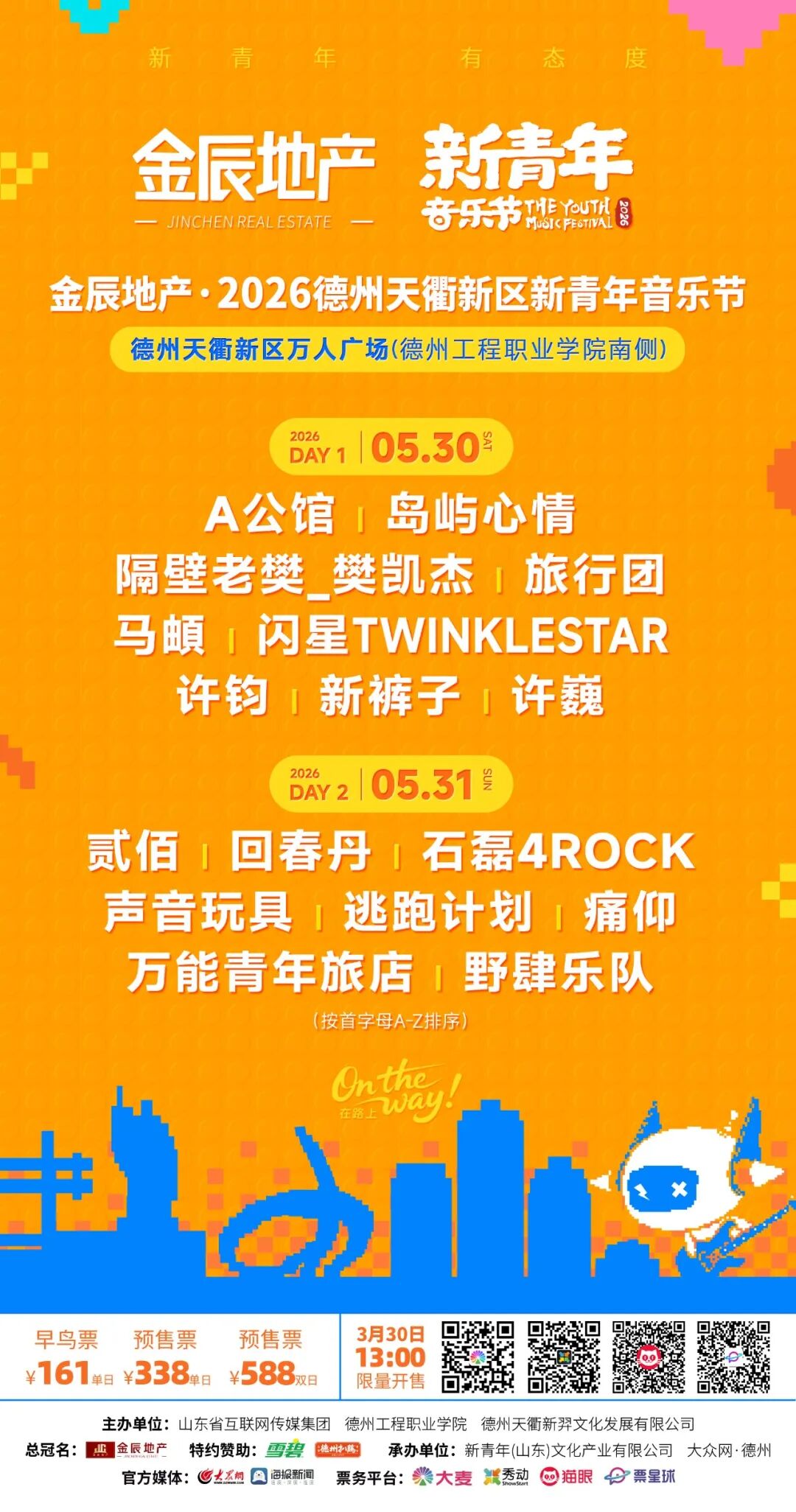 3月25日金辰地产·2026德州天衢新区新青年音乐节时间和阵容公布购票时间3月30日13时大麦网、秀动ShowStart猫眼、票星球同步限量开售(来源:新青年音乐节德州发布)