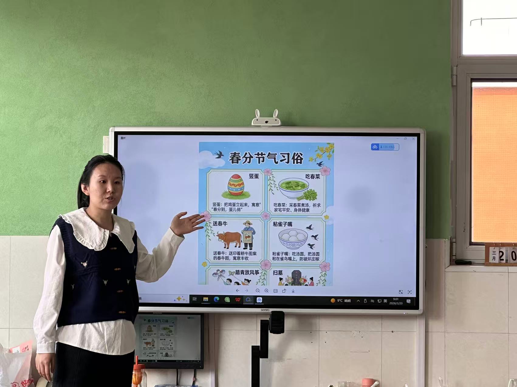 活动开始,老师通过图片、儿歌、小故事,向孩子们讲解春分节气的特点与放风筝、踏青等传统习俗,带领孩子们感知昼夜平分、草木萌新的春日景象,激发孩子们对自然与民俗的兴趣。