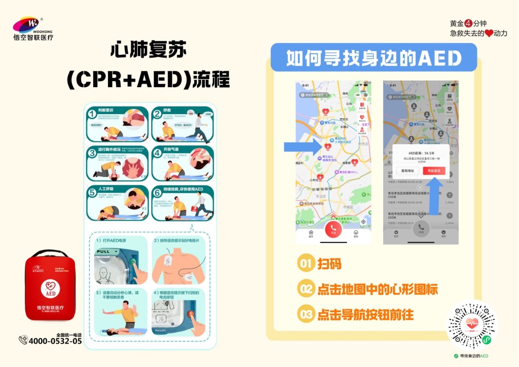 心脏骤停是危及生命的紧急情况,人体大脑在心跳停止后仅能耐受4至6分钟的缺氧状态,一旦超出这个时间,就会造成不可逆的脑损伤,因此,心脏骤停急救的“黄金4分钟”处置,直接决定着患者的生死。针对这一关乎生命的紧急救援事项,日前,青岛悟空智联医疗科技有限公司AED专家,从快速找到AED、规范开展心肺复苏两大核心环节,详细解读了关键的救命方法,为公众普及科学急救知识。