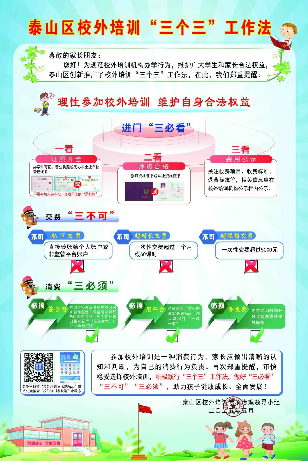 下一步,泰山区将持续深入推进校外培训“三个三”工作法,聚焦隐形变异培训精准整治,深化行业信用建设,强化数字赋能增效,加强执法队伍专业化建设,不断筑牢长效治理根基。我们深知,人民满意是我们的不懈追求——正是这份初心,让这张小小海报承载的民生温度,持续温暖泰山区的千家万户。