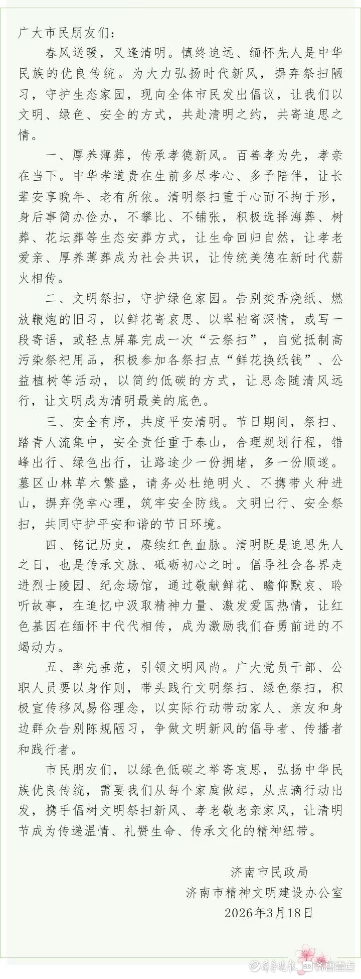 随着清明节的临近,为弘扬传统美德、倡导时代新风,近日,济南市民政局、济南市精神文明建设办公室联合向市民发出文明祭扫倡议,呼吁以文明、绿色、安全的方式寄托哀思,共同守护美好家园。