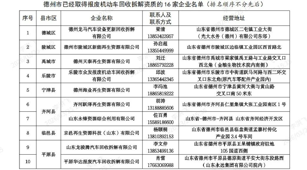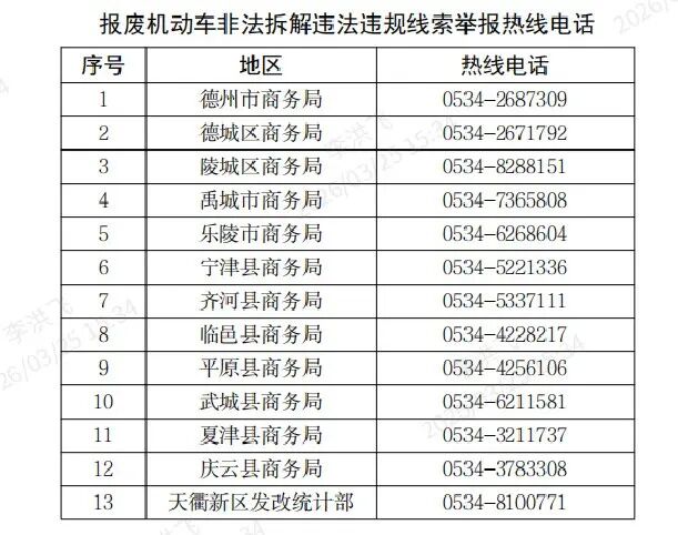 为进一步加强全市报废机动车回收拆解行业监管,严厉打击非法回收拆解等违法违规行为,规范行业经营秩序,近日,德州市正式向社会公布报废机动车回收拆解行业监督举报电话,以及截至2026年3月25日已取得报废机动车回收拆解资质的企业名单,主动接受社会各界监督。