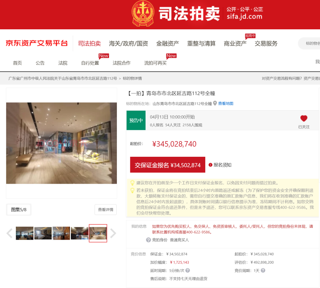 法拍平台信息显示,经现场调查确认,拍卖标的物对应建筑为青岛富力艾美酒店,建筑面积达51077.53平方米,房屋规划用途为商业,土地使用年限至2047年11月24日止。本次拍卖由广州市中级人民法院负责处置,申请执行人为招商银行广州分行,标的物所有权人为青岛万升酒店管理有限公司。拍卖将于4月13日上午10时正式启动,竞价周期为1天,属于首次拍卖,意向竞拍者需提前缴纳3450万元保证金方可参与竞价。