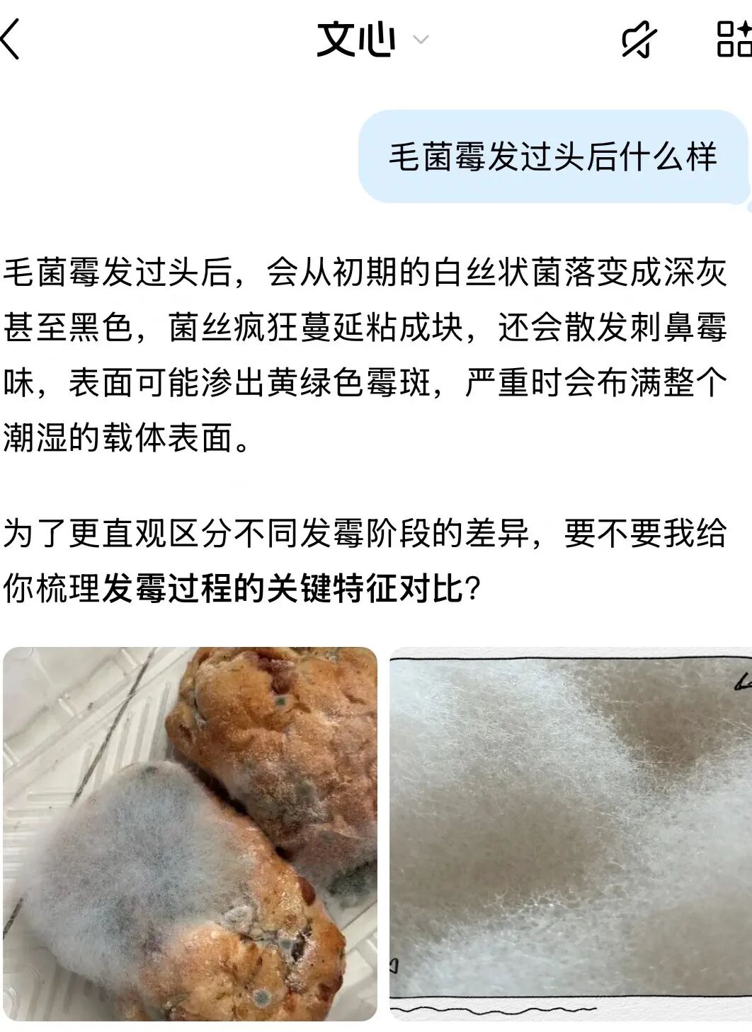 记者随后在文心App中输入“毛霉菌发过头后怎么样”,并未被回复相关令人不适的图片。