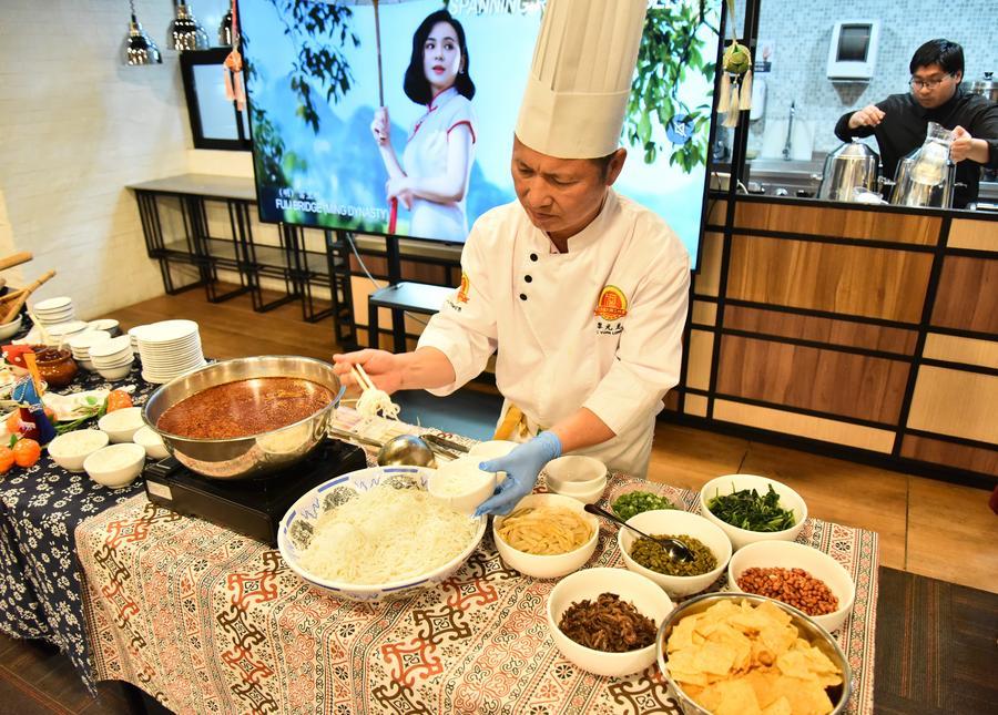 Li Yuanlong, an inheritor of Luosifen making technique from China's Guangxi Zhuang Autonomous Region, prepares a serving of Luosifen noodle during the "Chinese Culinary Night: A Taste of Guangxi" event in Bandar Seri Begawan, the capital of Brunei, Aug. 23, 2025. (Xinhua/Li Meng)