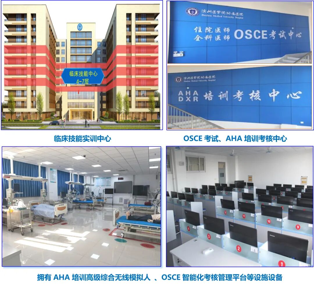 滨州医学院附属医院1998年被认定为省级住培基地,2014年获批为首批国家住院医师规范化培训基地,设立26个专业基地。现拥有建筑面积15000余平方米的临床技能实训中心、OSCE考试及AHA培训考核中心,拥有全功能模拟病人-SimMan、OSCE智能化考核管理平台、腹腔镜模拟训练系统、3D打印、全息投影眼镜、高智能分娩机转示教模型、数字式手术教学转播系统等培训设施设备,可实现模拟训练、信息化教学、标准化病人(SP)应用及OSCE考核等功能。