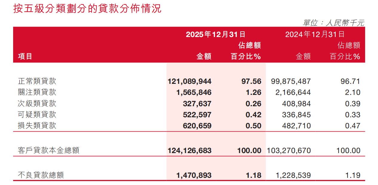 截至2025年末,泸州银行的资产总额为2024.62亿元,不良贷款余额为14.71亿元,较2024年末的12.29亿元增加2.42亿元,同比增长约20%;不良贷款率为1.18%,较2024年末的1.19%下降0.01个百分点。