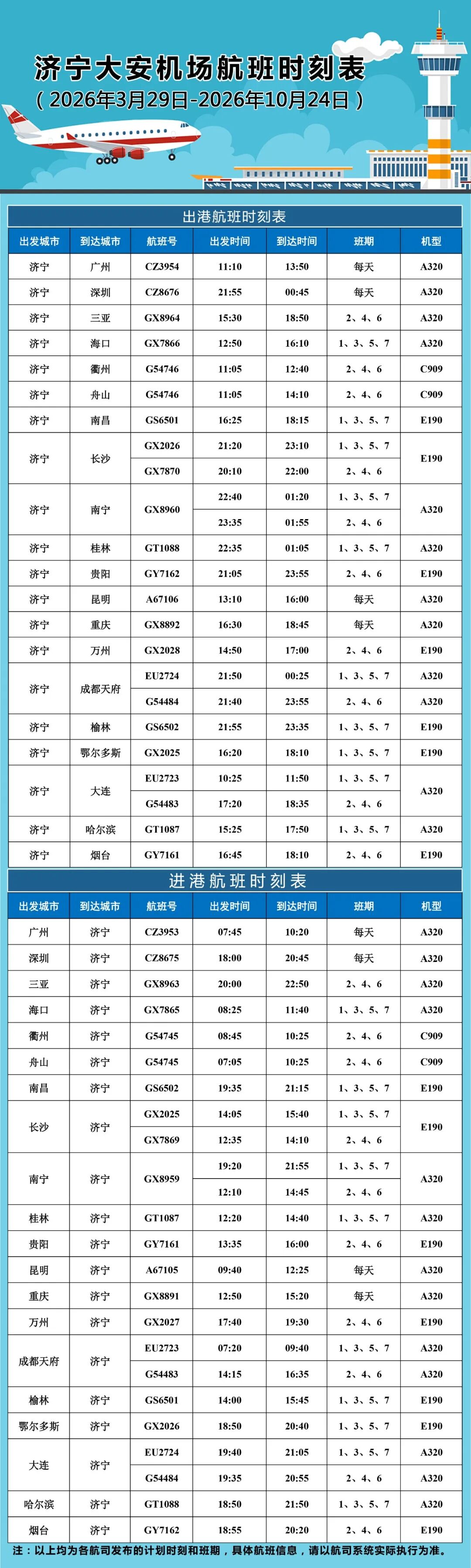 3月29日起,济宁大安机场将执行2026年夏秋航季航班计划。