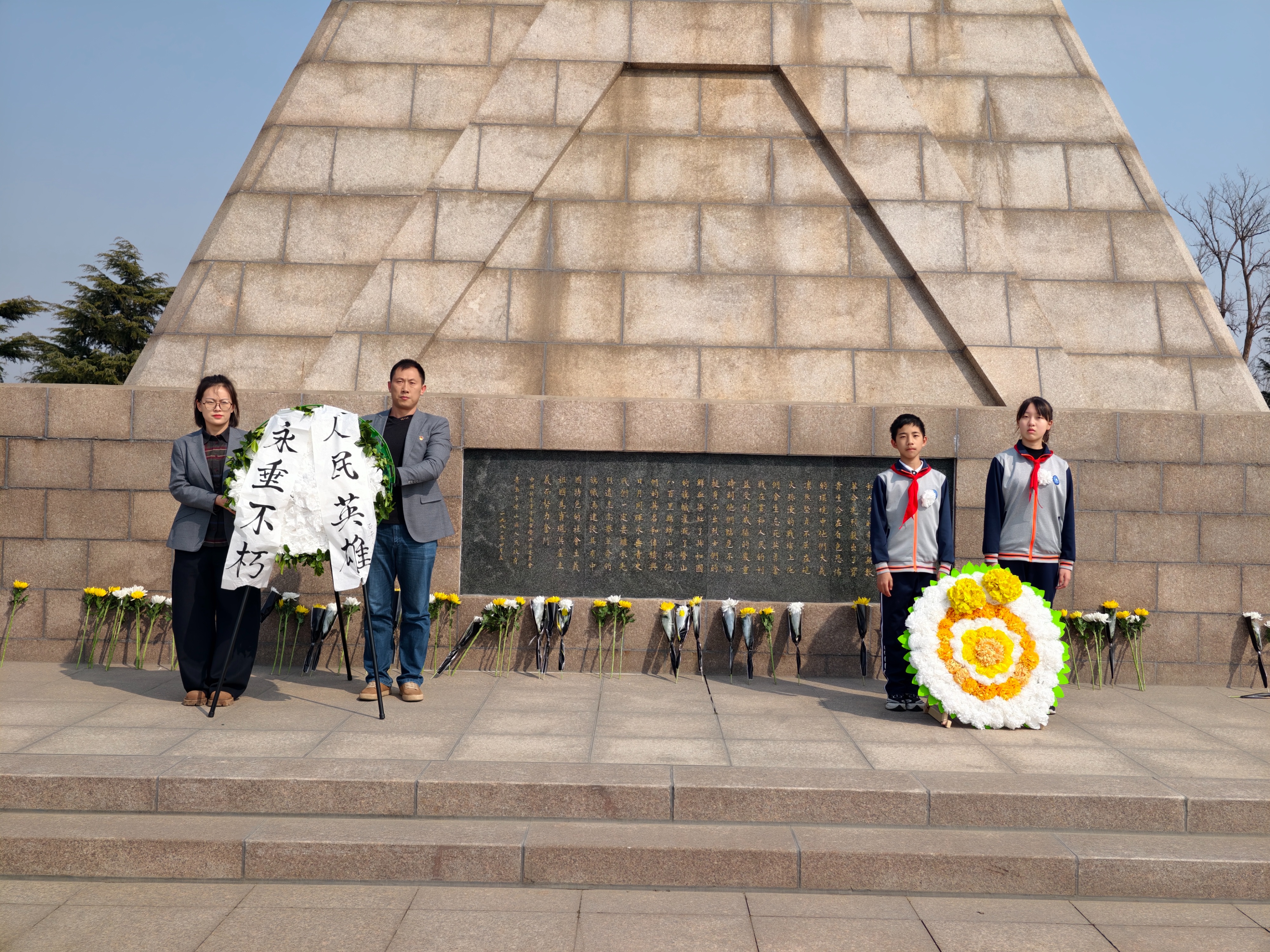 当天上午,全体师生庄严肃立于革命烈士纪念碑前,高唱国歌,向英烈默哀一分钟,聆听陵园工作人员讲述崂山革命先烈的英勇事迹。在庄重的公祭仪式中,师生们深切感受烽火岁月的艰辛与革命先辈的坚定信仰。公祭仪式结束后,学校举行简短而庄重的祭奠仪式,师生代表在革命烈士纪念碑前敬献花圈。