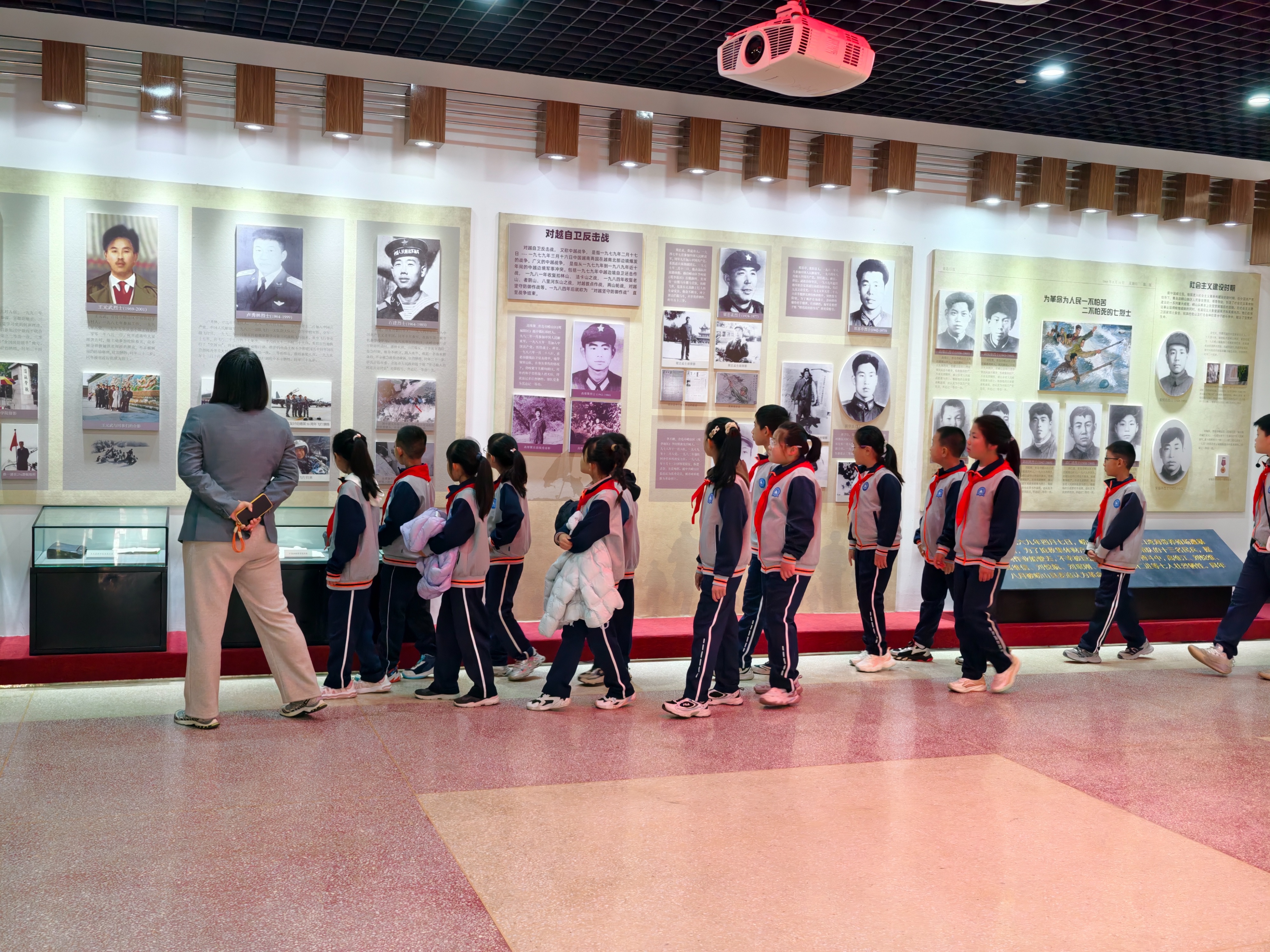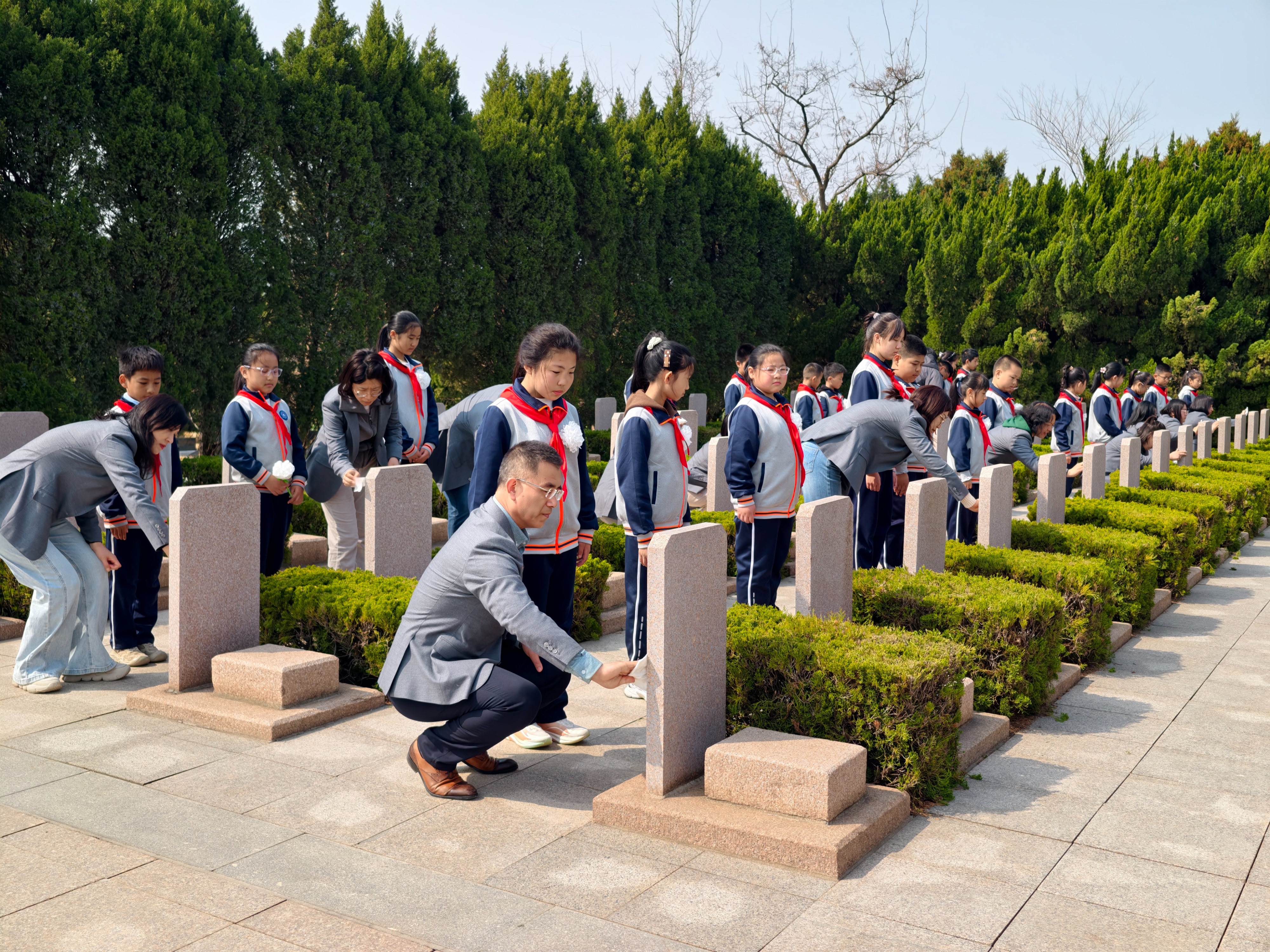 随后,师生们来到东墓区,全体党员教师面向党旗重温入党誓词。接着,党员教师转身面向少先队员,站立两侧形成“守护者”的姿态。少先队大队长带领全体队员重温入队誓词,稚嫩而坚定的声音在陵园上空回荡。