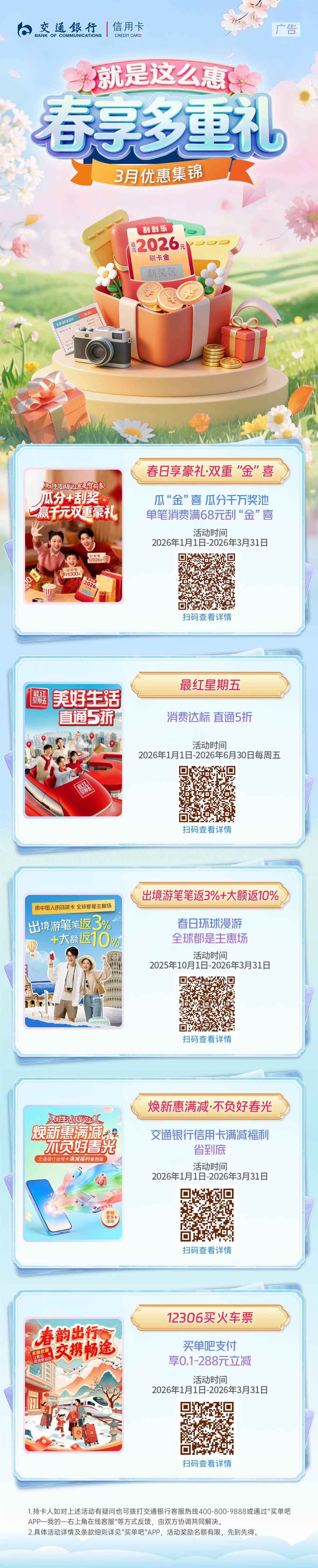 春日礼遇已就位,交行信用卡多重好礼宠粉不停大众报业·齐鲁壹点 2026-03-25 19:23:14春日礼遇已就位,交行信用卡宠粉不停,消费满额刮惊喜刷卡金,最红周五享5折优惠;环球漫游笔笔有返现,焕新满减+购票立减,多重好礼陪你过春天!责任编辑:董丽霞