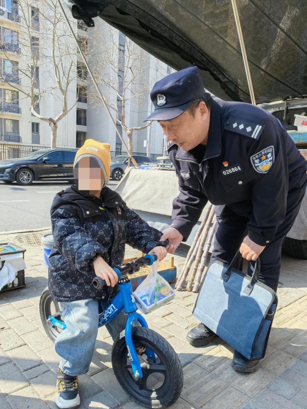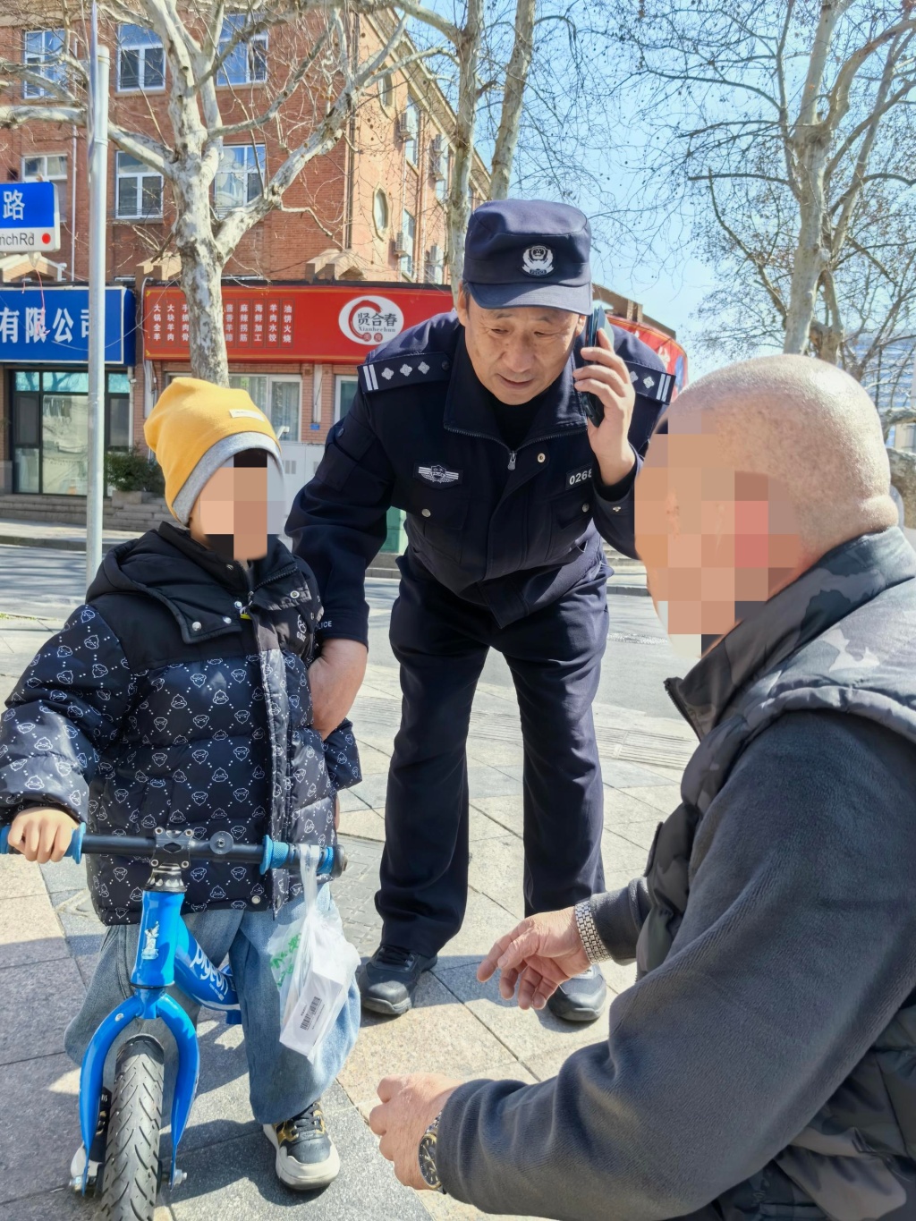 3月17日10时20分许,民警钱树林、韩天真按照工作安排,正在辖区内开展社区走访工作,当行至鞍山二路与抚顺路交叉口附近时,一个小小的身影引起了他们的注意——一名年幼的小男孩独自骑着儿童小自行车,在路边漫无目的地徘徊,身边没有任何家人陪伴,小小的脸上满是慌张与无助。凭借多年的社区工作经验,民警敏锐地意识到,孩子大概是与家人走散了,担心孩子在路边停留存在安全隐患,两人立即快步上前,温柔地与孩子打招呼、沟通询问。