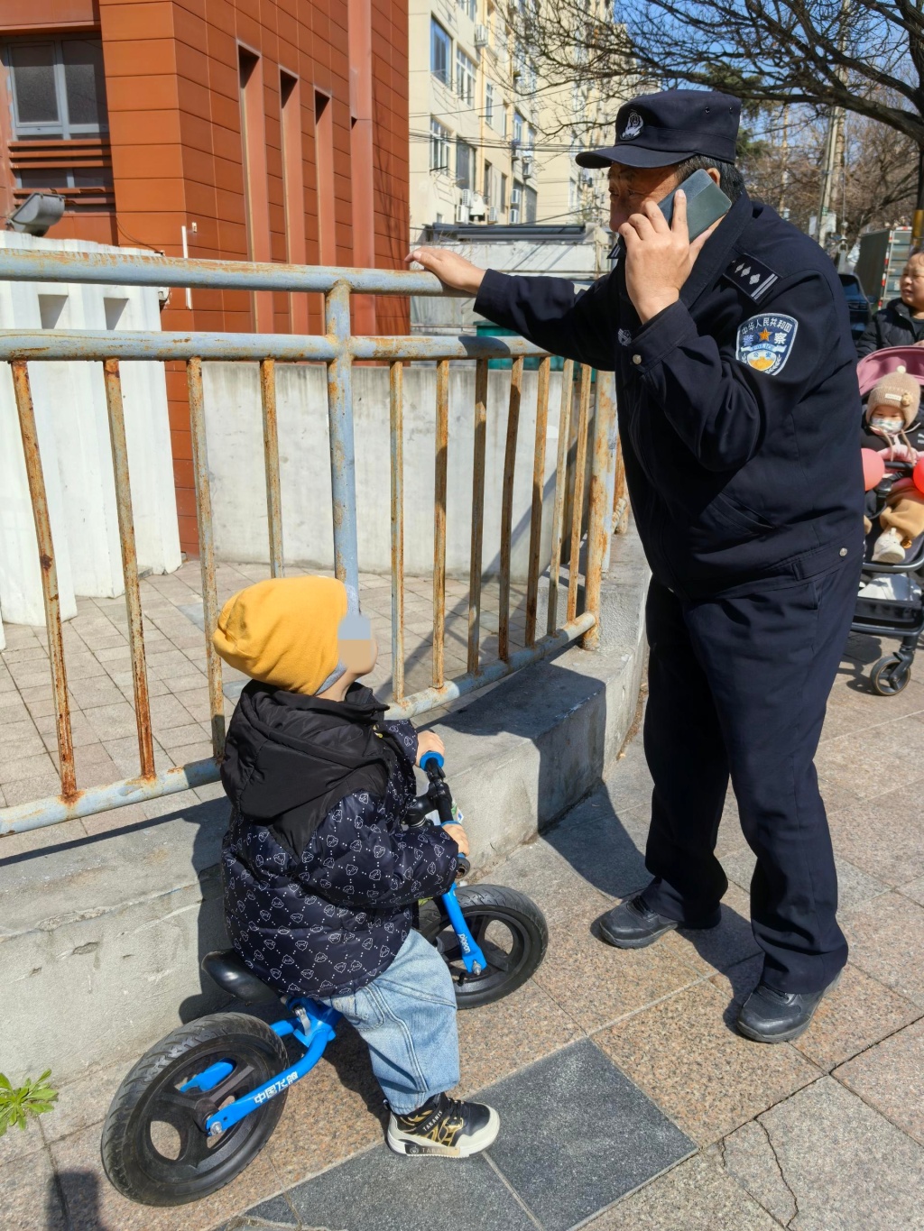 面对陌生的民警,小男孩显得十分害怕,说话也有些语无伦次,经过民警耐心的安抚与引导,孩子渐渐放松了情绪,断断续续地说出自己是与奶奶走散了,找不到奶奶后十分着急,只能骑着小自行车到处寻找。了解情况后,民警钱树林一边继续温柔陪伴孩子、安抚其情绪,一边第一时间将现场情况向派出所汇报,请求所内同事协助排查寻找孩子的家人。