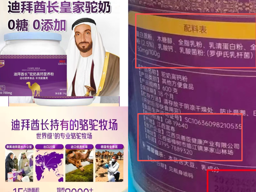 以多平台在售的“迪拜酋长驼奶高钙营养粉”为例,页面大篇幅呈现“迪拜酋长皇家驼奶”“迪拜酋长持有的骆驼牧场”等宣传语。然而配料表显示,排在前列的主要是蛋白质粉、木糖醇、麦芽糊精、全脂乳粉等常规原料。当问及“全脂驼奶粉”来源时,店铺工作人员坦言产品是“国产的”,原产地为新疆,并称“迪拜酋长”只是一个商标。