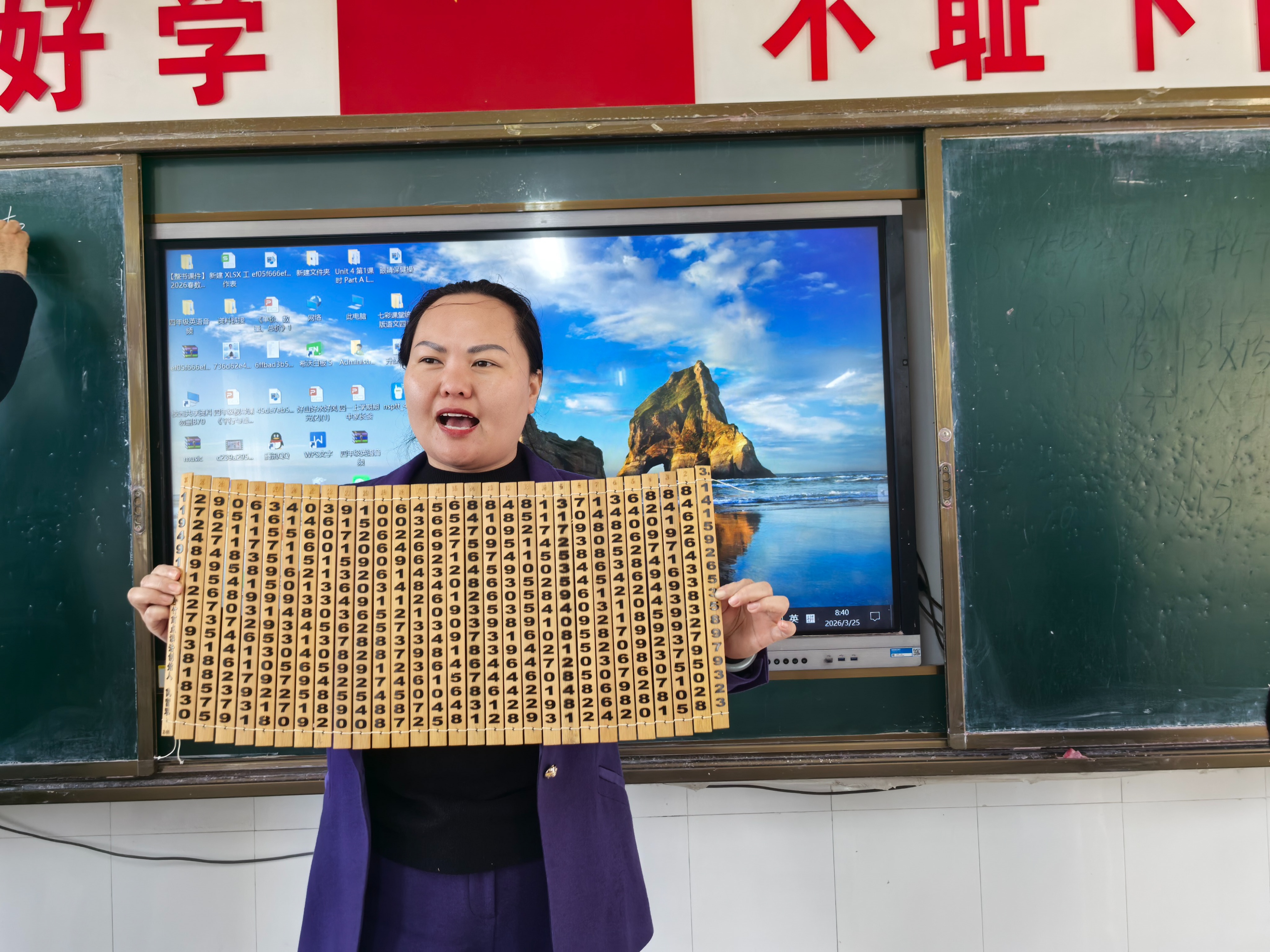 当日上午,在全国雷锋学校——虎头李小学的教室里,孩子们端坐在课桌前,眼神里满是期待。当工作人员将一捆捆刻有圆周率的竹简摆放整齐时,教室里瞬间响起阵阵惊叹声。“这就是古代人读的‘书’吗?摸起来凹凸不平的,好特别!”同学们忍不住伸出小手,轻轻抚摸着竹简上的数字,眼里闪烁着好奇的光芒。