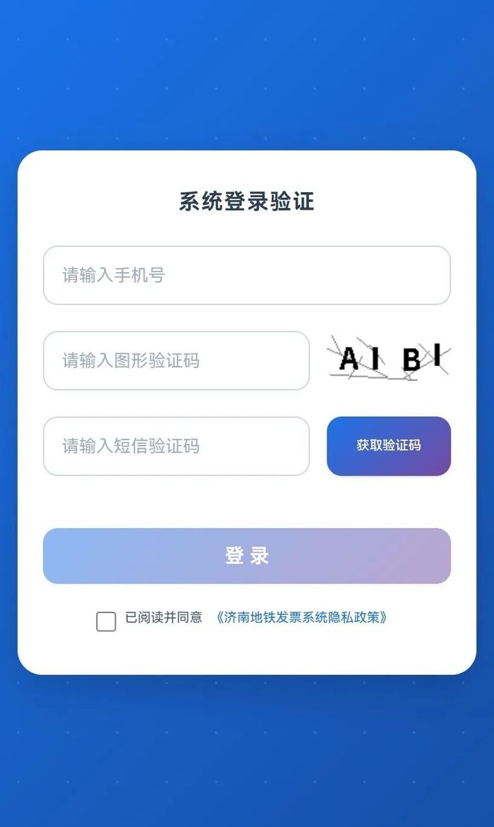 扫描车站自助售票机或客服中心玻璃上张贴的“济南地铁发票系统”二维码;首次登录需输入手机号、获取验证码,勾选同意用户协议后完成登录。