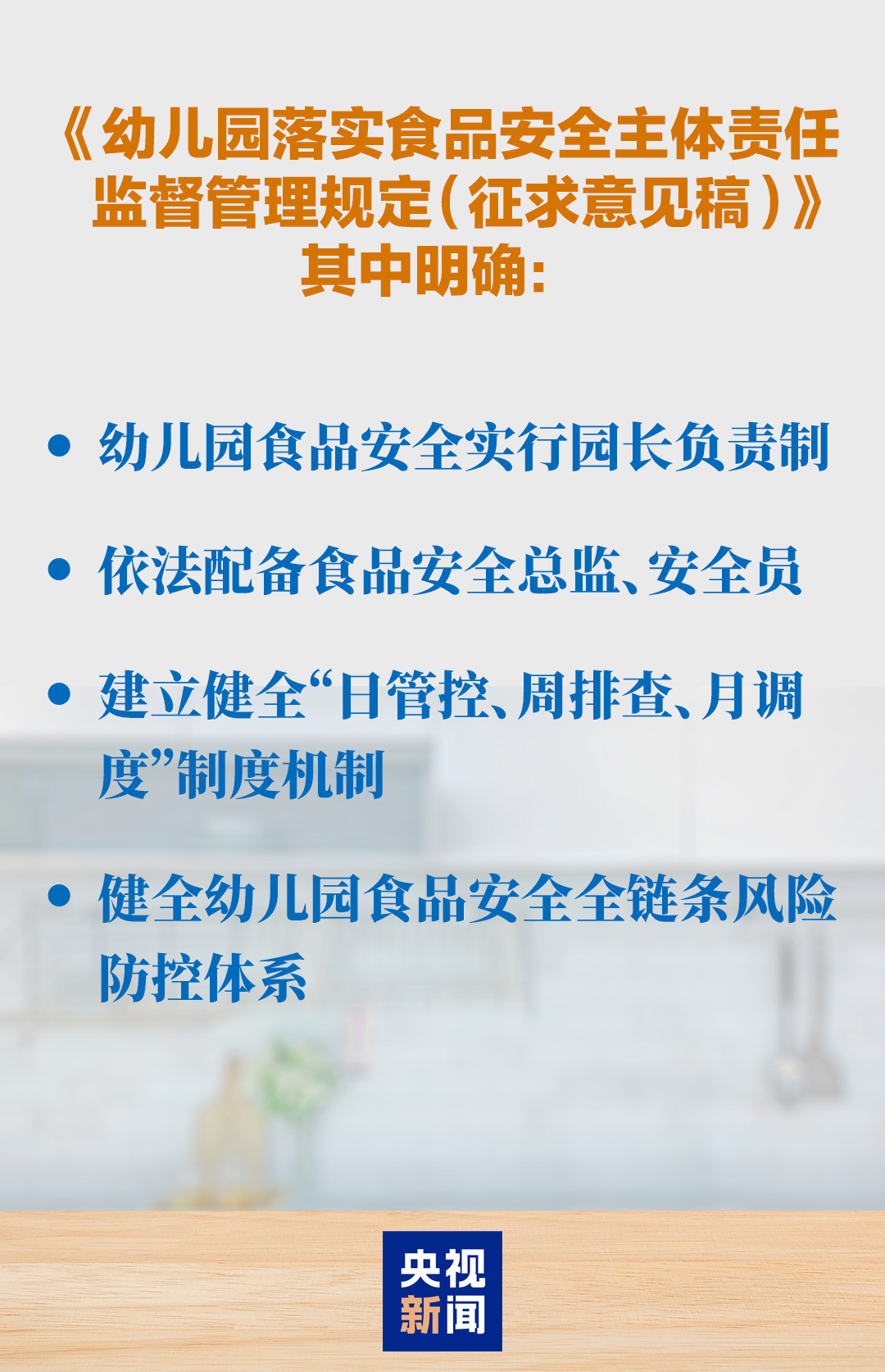 3月25日起,市场监管总局就《幼儿园落实食品安全主体责任监督管理规定》面向社会公开征求意见。《征求意见稿》明确幼儿园食品安全实行园长负责制,建立“日管控、周排查、月调度”制度机制,落实幼儿园食品安全全链条风险防控。