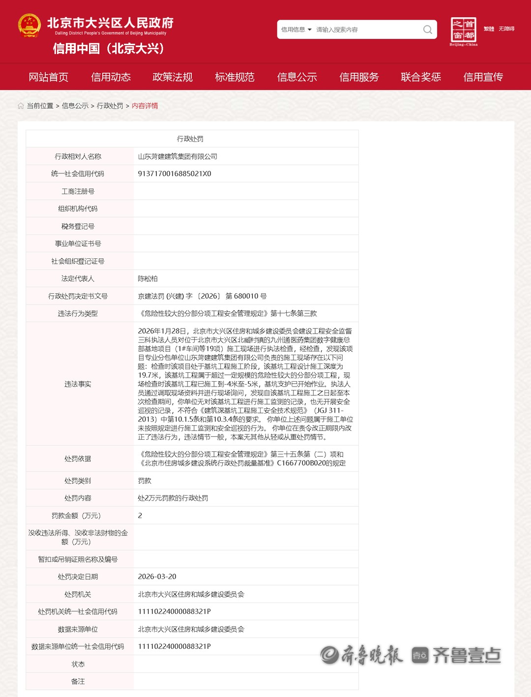近日,齐鲁晚报·齐鲁壹点记者从信用中国(北京大兴)获悉,山东菏建建筑集团有限公司因施工安全问题,被北京市大兴区住房和城乡建设委员会罚款2万元。