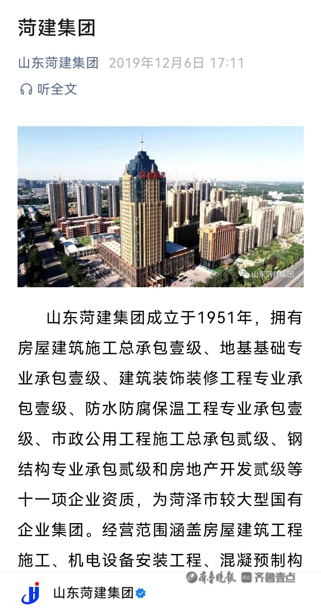 该公司官方公众号显示,山东菏建集团成立于1951年,拥有房屋建筑施工总承包壹级、地基基础专业承包壹级、建筑装饰装修工程专业承包壹级、防水防腐保温工程专业承包壹级、市政公用工程施工总承包贰级、钢结构专业承包贰级和房地产开发贰级等十一项企业资质,为菏泽市较大型国有企业集团。经营范围涵盖房屋建筑工程施工、机电设备安装工程、混凝预制构件、建筑装饰装修工程、金属门窗工程、地基与基础工程、建材经销、市政工程施工、钢结构工程施工、体育场地设施工程、建筑幕墙工程、机械设备租赁、防腐保温工程、外墙保温工程施工、园林、园林绿化、石油化工工程施工等20余个领域。集团拥有在册职工2000余人,下辖7个子公司、11个项目管理分公司、8个专业分公司、6个驻外分公司,年生产能力达60亿元以上。