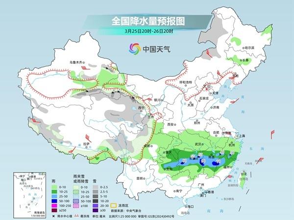 25日夜间,贵州中南部、湖南中部、江西中部有中到大雨,局地将有暴雨,或伴有短时强降雨等强对流天气;26日白天,随着急流东移,江西中部、福建北部将有中到大雨,局地暴雨。