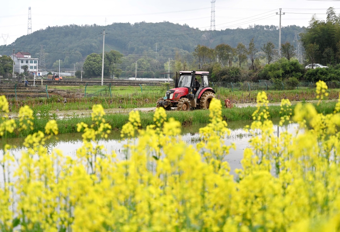 3月25日,浙江省金华市武义县王宅镇仁村农民驾驶农机翻耕水田,准备插种早稻。新华社