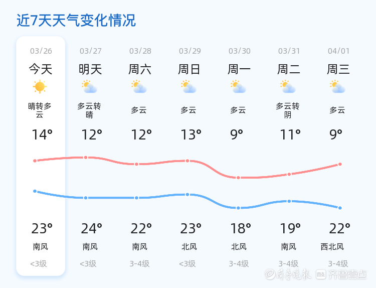 今天是2026年3月26日,星期四,农历二月初八。泰安市今日天气晴转多云,气温在14℃到23℃之间,东北风1级,空气湿度为89%,PM2.5指数为117。全市各区天气情况总体平稳,以晴转多云为主,气温适宜,市民出行较为舒适。明天天气情况与今天相比有所变化。明天泰安市天气为多云转晴,气温将在12℃到24℃之间,南风风力较小。与今日相比,明天气温略有上升,天气状况更加晴朗,市民可以适当调整衣物,以应对气温的变化。未来三天天气趋势显示,泰安市将以多云天气为主,气温在12℃到24℃之间波动。风力方面,部分时段可能达到3-4级,市民在户外活动时需注意防风保暖,尤其是老人和儿童,建议适时增添衣物。温馨提示