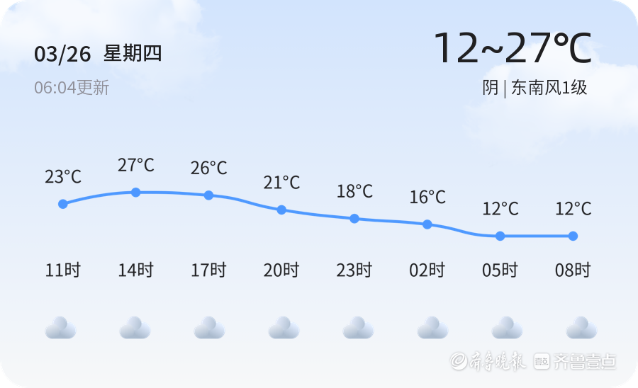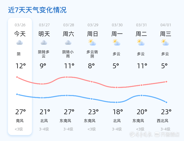 今天是3月26日,星期四,农历二月初八。潍坊市今日天气阴,气温在12℃至27℃之间,东南风1级,空气湿度75%,PM2.5指数为123。目前实时温度11℃,阴天,风力较小,体感略凉。各区天气情况总体一致,均为阴天,气温略有差异但变化不大。明天潍坊天气将由阴转多云,气温有所下降,预计在9℃至21℃之间,北风3-4级。与今日相比,明日天气以多云为主,风力有所增强,气温明显降低,市民出行需注意保暖。未来三天,潍坊市天气将呈现阴转小雨的趋势。周六阴转小雨,气温11℃至27℃,东南风3-4级;周日多云转阴,气温8℃至23℃,东南风<3级;周一多云,气温5℃至18℃,北风3-4级。降雨天气可能带来道路湿滑,市民需注意出行安全,及时添减衣物,防范感冒。温馨提示