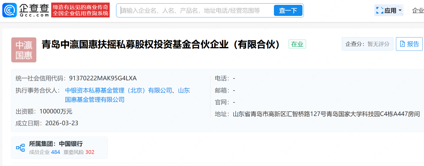 企查查信息显示,3月23日,青岛中瀛国惠扶摇私募股权投资基金合伙企业(有限合伙)(下称“青岛中瀛”)注册成立。
