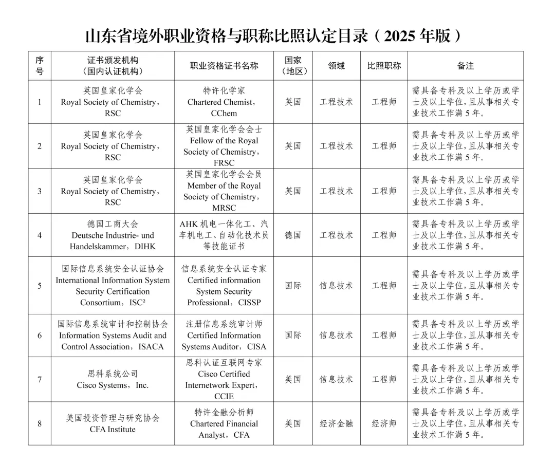 该清单精准匹配持证人才在淄工作生活需求,为淄博市持有《山东省境外职业资格与职称比照认定目录(2025年版)》和《山东省境外职业资格服务目录(2025年版)》内证书的专业技术人才提供专属政策支持。
