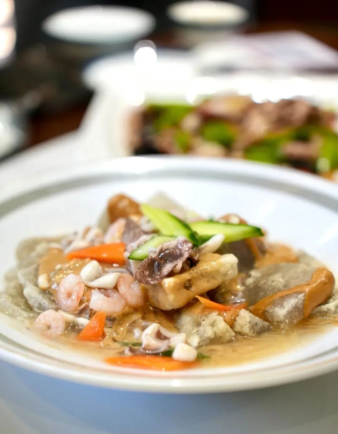 烟台海域出产的大对虾,个头饱满、肉质紧实,鲜度和品质远超普通海虾。这道菜的精髓在于“㸆”制工艺,小火慢煨、收汁入味,把鲁菜的火候功夫展现得淋漓尽致。